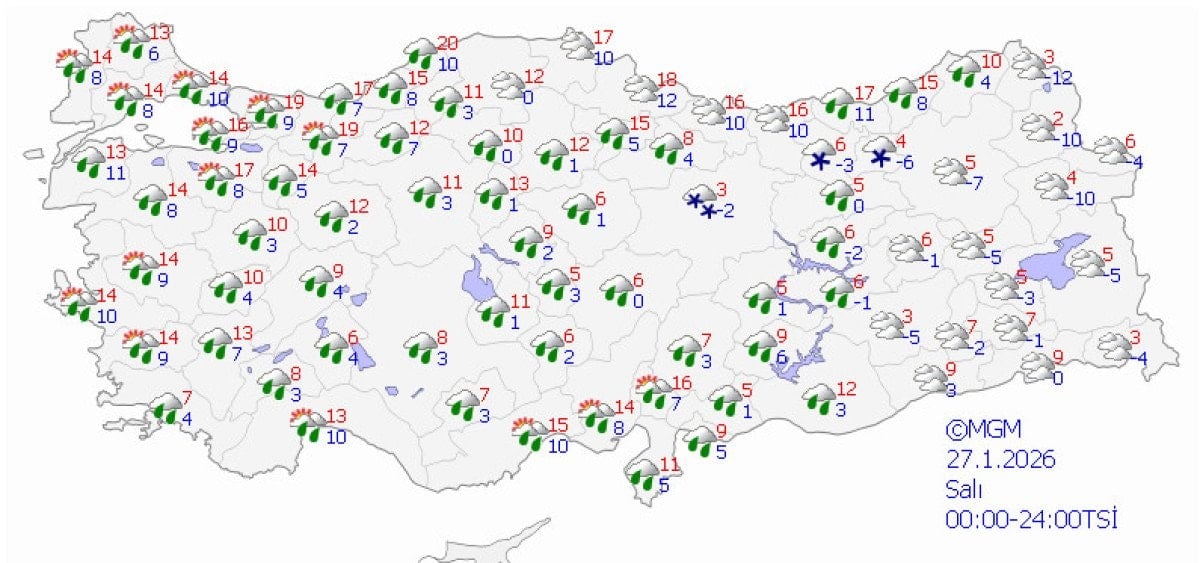 Yağışların kıyı kesimlerde yağmur ve sağanak, batı bölgelerde yağmur ve karla karışık yağmur, iç ve doğu kesimlerde ise kar şeklinde görüleceği tahmin ediliyor. Marmara’nın batısı, Kıyı Ege ve Hatay’da kuvvetli yağış; Antalya çevrelerinde çok kuvvetli ve şiddetli yağış; Güneydoğu Anadolu ile Sivas, Kayseri, Yozgat, Nevşehir, Elazığ, Tunceli, Bitlis, Bingöl, Malatya, Kahramanmaraş ve Osmaniye çevrelerinde kuvvetli kar yağışı bekleniyor.